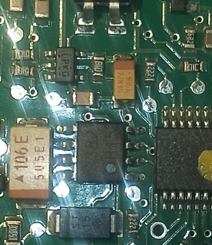 theking0 ha scritto:iniziamo col capire dove da a collegarsi, quel componente con 5 pin poco più in basso, vedi dove entra quella pista. Mi confermi che c'è scritto "LPKG" ?