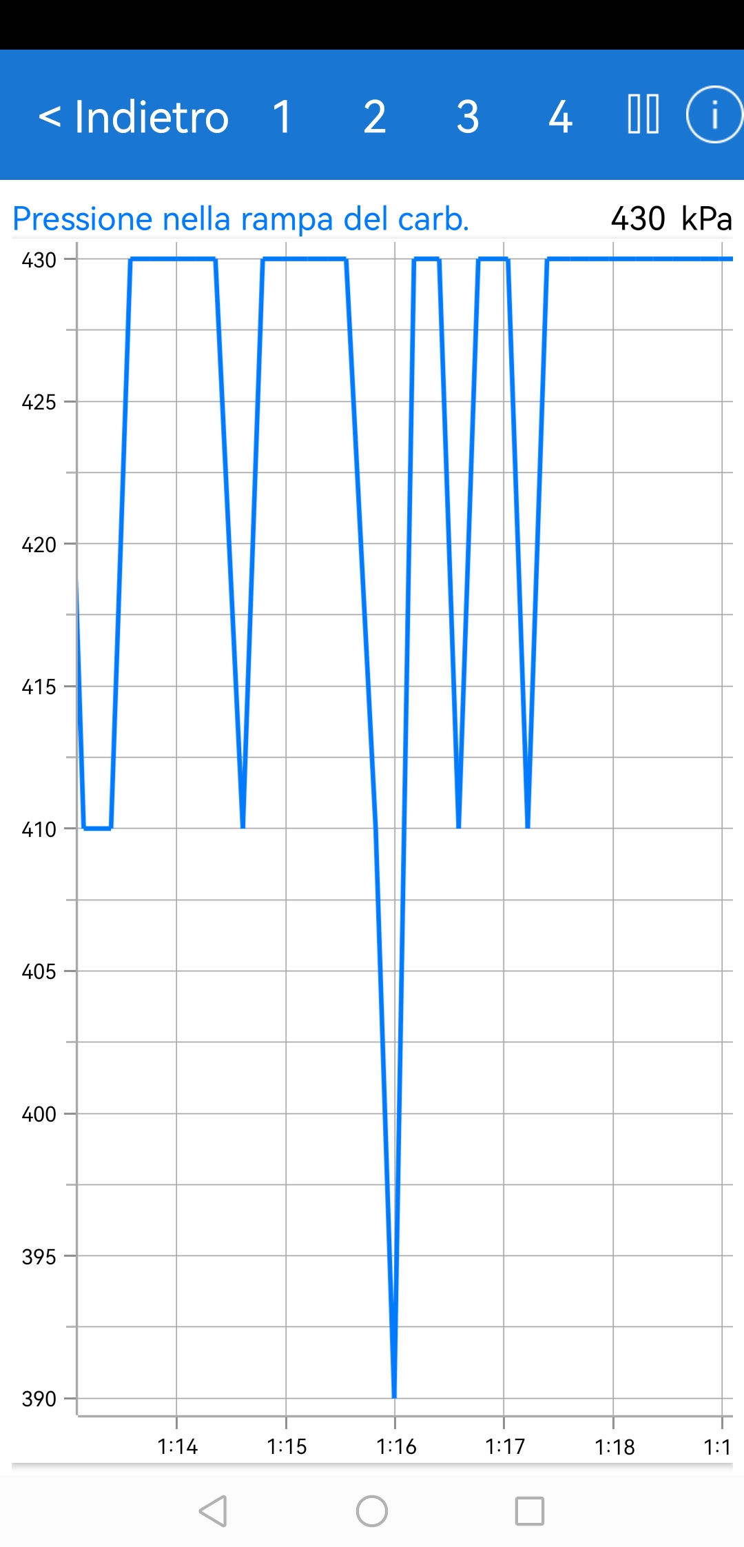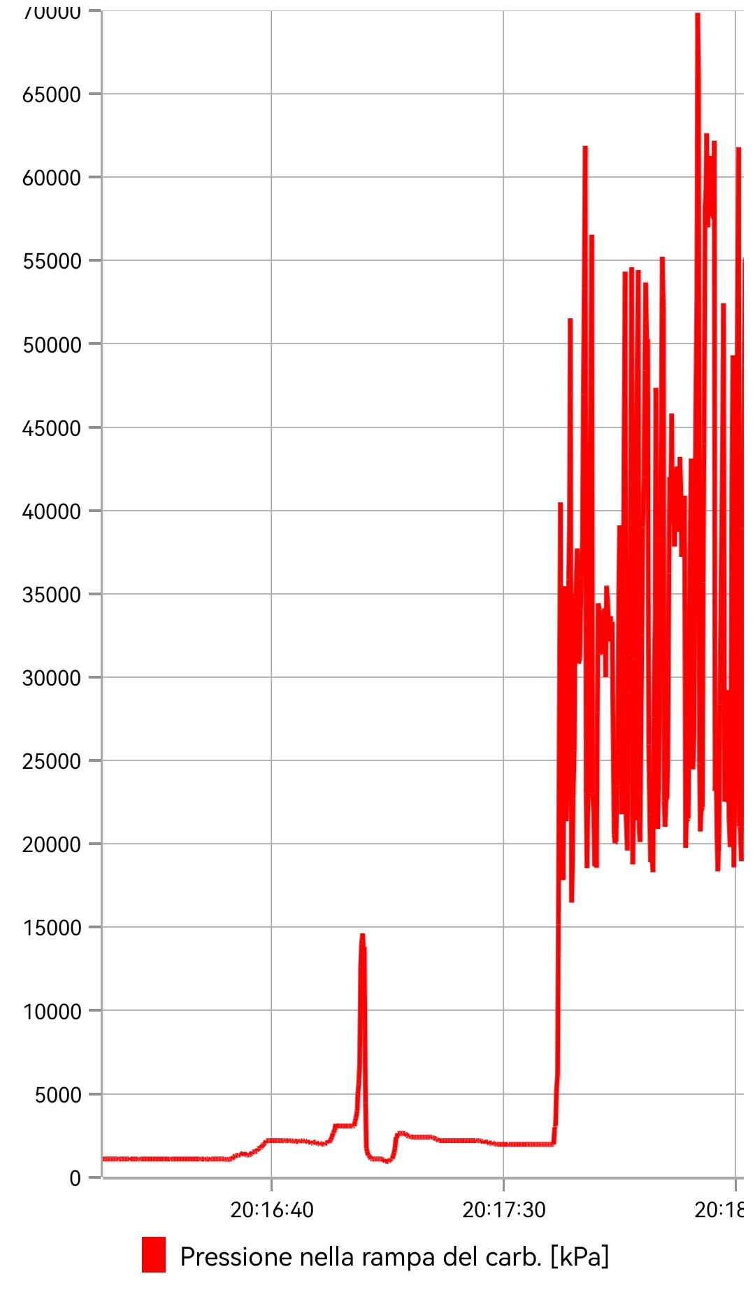 il rilevamenro pressione rampa carburante mi da con a motore fermo , sia durante l'avviamento, e sia la con tubazione alta pressione staccata da un iniettore, sempre questi valori altalenanti (qui riporto un periodo di pochi secondi)