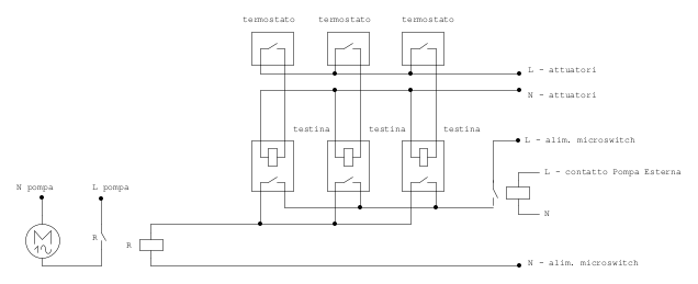 Poi ho un buco di trent'anni, fino ad arrivare a quando dovevo entrare ad abitare nella casa nuova a ridosso dell'inverno, con caldaia a pellet, puffer con relativo circolatore, pompe ACS e ricircolo per scaldare un boiler servito anche dai pannelli solari termici, infine due pompe di riscaldamento, una per il circuito ad alta temperatura ed uno per la bassa (impianti a pavimento). Qui i collegamenti sono stati effettuati dal tecnico della ditta di idraulici, il termotecnico gli ha fatto eseguire la prima soluzione che angus ha indicato al primo post per comandarle con le rispettive zone.