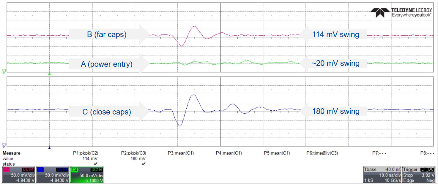 Localmente, proprio a ridosso del gate driver, la distribuzione viene fatta sui layer esterni, collegati con un singolo via al resto del power distribution network, proprio per localizzare il droop/bounce.