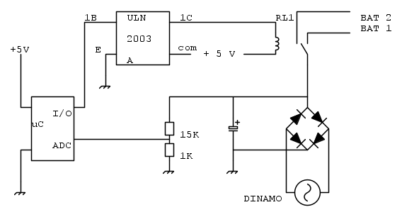 Il circuito serve a misurare la tensione mediante partitore di un motore utilizzato come generatore, la corrente generata passa quindi per un regolatore di carica e viene inviata ad una prima o una seconda batteria (La scelta viene fatta dal microcontrollore che agisce sul relé)