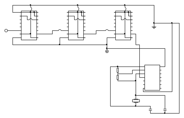 2) ho un dubbio, in quanto vorrei utilizzare per l oscillatore al quarzo uno da 1MZ e poi mettere in cascata 3 4518 per avere 1 Hz in uscita ma non riesco a capire lo schema che devo fare... per chiarire adesso ti faccio uno schema dei 3 integrati cosi ci capiamo meglio...