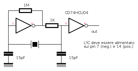 Per l'oscillatore, io ho adoperato un TTl 7404 perche' non avevo altro, cosi' come successivamente ho adoperato dei 7400 ma, gia' che lo fai, e' consigliabile l'uso del 74HCU04 CMOS che e' costruito a posta per l'uso specifico.
