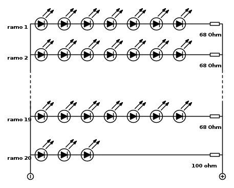 si potranno collegare 19 rami di diodi led in parallelo,ognuno dei rami è composto da 7 diodi led in serie con un resistore serie del valore di 68 Ohm, ed un ultimo ramo composto da tre diodi led in serie con un resistore del valore di 100 ohm.