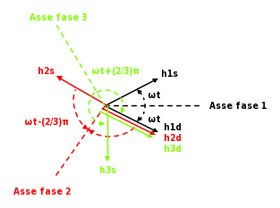 2. I vettori rotanti in senso orario (h1d, h2d e h3d), risultando sempre appaiati, danno luogo ad un campo magnetico risultante rotante in senso orario e avente ampiezza costantemente pari 3/2 Hmax (Hmax è l'ampiezza dei singoli campi magnetici pulsanti).