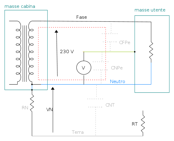 Avendo scollegato il conduttore di terra, quindi la resistenza di terra RT dalle masse utente, queste risultano flottanti e, con esse, il conduttore di protezione che vi è collegato.