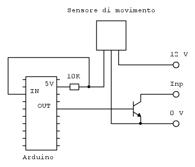 Il sensore di movimento l'ho preso a parte e funziona alimentandolo a 12V e una volta rilevato il movimento porta a livello basso il pin Alarm. Questo segnale lo do in ingresso ad un Arduino che mi dovrà gestire altri processi e che mi segnalerà in uscita la fine dei processi e la riapertura della porta (uso i 5V dell'arduino per il pull-up del pin di Alarm).
