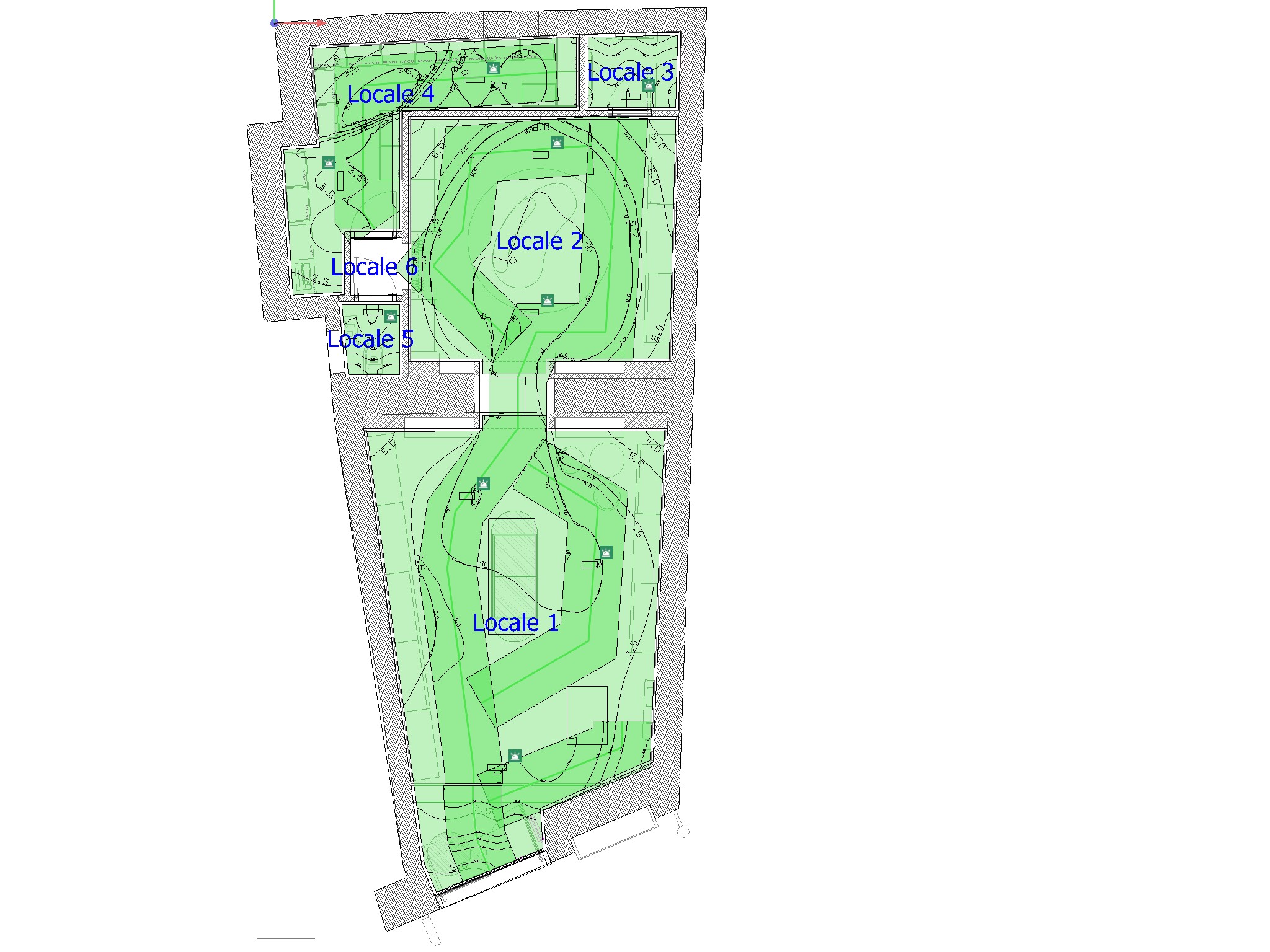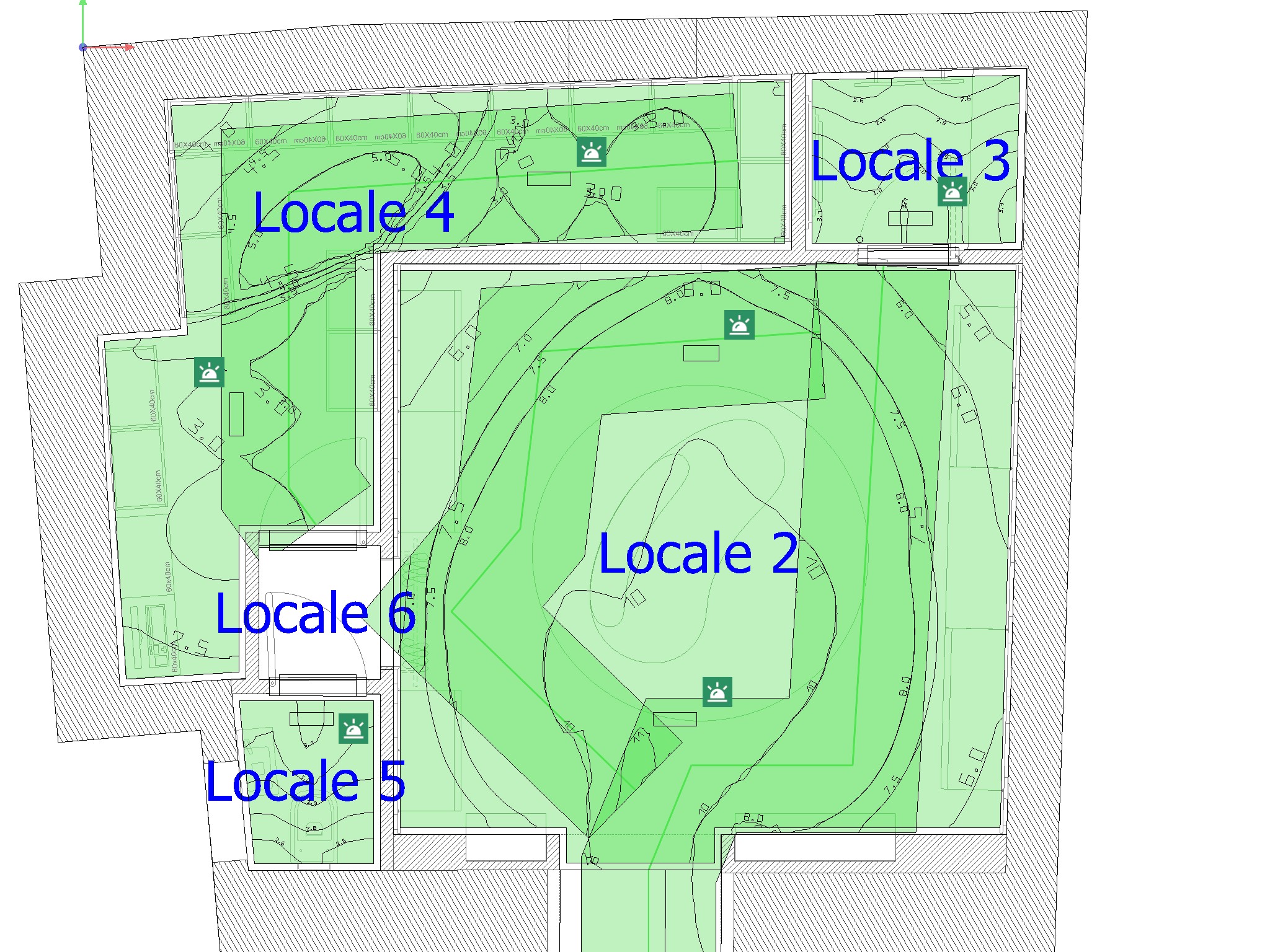 3,6 lux minimi nei locali grandi, mediamente 8lux sulle vie di esodo.