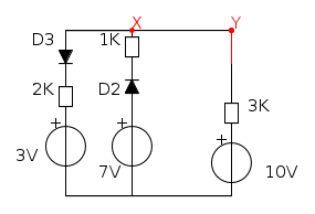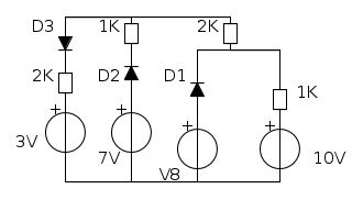 Quindi D2 e D3 risultano in conduzione in quanto D2 va da 7 a 3,66 e D3 va da 3,66 a 3 volt.