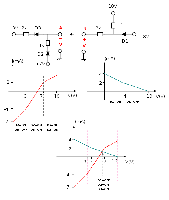 Le caratteristiche sono di facile tracciatura ed i segmenti di retta presentano una pendenza proporzionale alla conduttanza vista ai morsetti nei diversi intervalli; per il primo bipolo, per esempio, sarà quella relativa a 1mS sotto i 3V, a 1.5 mS fra 3V e 7V ed infine di 0.5mS sopra i 7V, conduttanze che saranno ricavabili in funzione dello stato dei diodi; il possibile range del punto di lavoro è chiaramente interno all'intervallo [3V,10V].