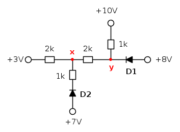 Supponendo di scollegare D1 e D2 e di calcolare i potenziali di VB=10-7/5=8.6 e di VA=3+14/5=5.8, ricordando che la riconnessione di D1 e D2 non può che fare aumentare il potenziale dei punti interni alla rete (essendo connessi alla stessa per via catodica non potrebbero infatti che iniettare corrente nella stessa, portando un contibuto positivo ai potenziali di tutti i nodi interni)
