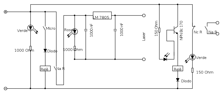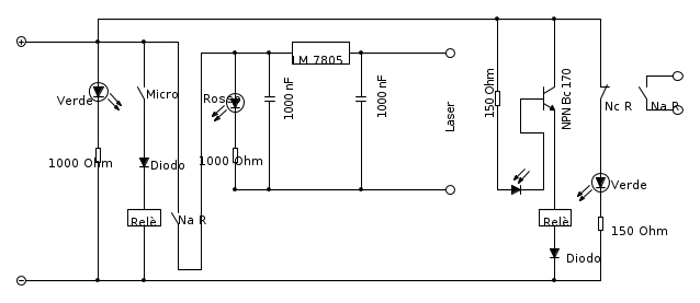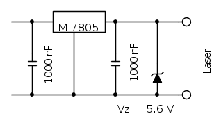 Finalmente vorrei suggerirti la complicazione seguente, che salverebbe il laser nel caso, se brucia il LM7805.