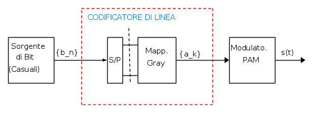 Dove ho una sorgente che da in uscita un flusso di bit, questi entrano in un convertitore che aspetta gli l bit e fa una codifica bipolare diretta ad L livelli con mappatura Gray ad infine viene costruito il segnale elettrico dal modulatore PAM, con naturalmente impulso