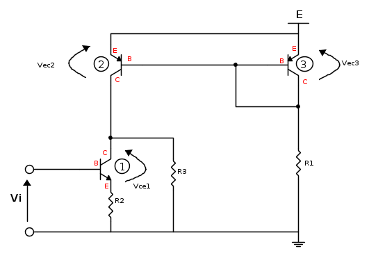 Se quindi la Ic emessa da TR2 vale circa 1.98mA e quella assorbita da TR1 vale 1mA, essendoci nel collegamento tra i due collettori il nodo dove si innesta R3,vuol dire che l'esubero scorre in R3...il resto è ovvio.