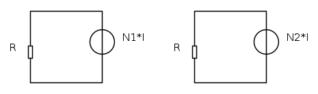 Premesso che non capisco come quel sistema possa essere a regime, se le ancore possono muoversi, essendo solo imperniate, per quanto riguarda il tuo circuito equivalente magnetico, vorrei solo farti notare che i due avvolgimenti N1 ed N2 non risultano in serie e di conseguenza non sono attaversati dalla stessa corrente I.