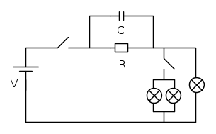 Ho intenzione di costruire un circuito rc come quello che ho disegnato e allegato. Aprendo l'interruttore "generale" il condensatore va in scarica e quindi le lampadine (una o tre in base al secondo interruttore) si spengono lentamente.