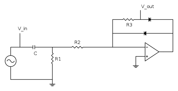 l'altro giorno in laboratorio ho dovuto realizzare il circuito in figura e tramite l'utilizzo dell'oscilloscopio prelevare i valori picco-picco di V_{in} e V_{out} per diverse frequenze 10Hz, 100Hz....30kHz, 50kHz avendo impostato l'ampiezza picco-picco del generatore di 2V.