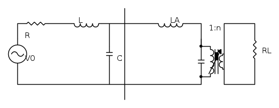 L'esercizio chiede di rappresentare quanto sta alla sinistra della riga nera verticale mediante un generatore equivalente di Thevenin (nel dominio dei fasori), di determinare i valori di LA e del rapporto di trasformazione n che danno luogo al massimo trasferimento di potenza al carico RL.