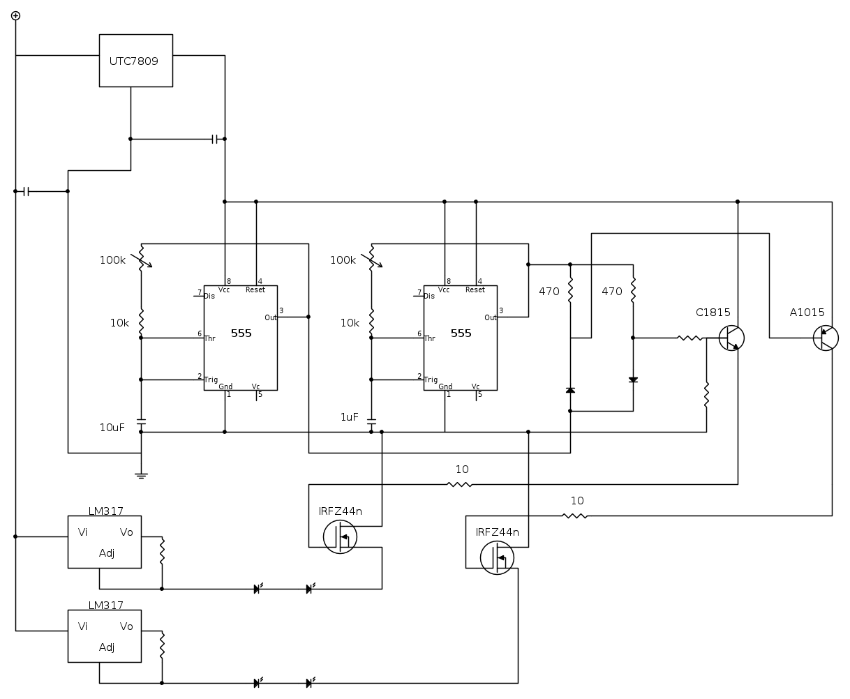 il 555 di sinistra stabilisce quale led far accendere, il secondo il base alla frequenza decide quanti flash, ma non riesco a capire in che modo il primo decice quale led accendere, o meglio le strade che fanno i segnali per far scattare i 2 transistor.