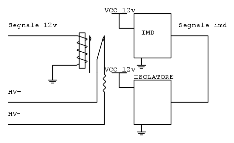Praticamente nella scatola dell'elettronica analogica della vettura elettrica che abbiamo costruito convivono un relè che funge da scaricatore per i condensatori dell'inverter di trazione , il monitor di isolamento ( imd bender a isometer 155 3203 ) ed il suo circuito di isolamento, cioè un flip flop che nel momento in cui l'imd rileva un guasto questo disalimenta i relè di potenza finché non viene premuto un pulsante di reset.