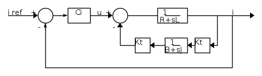 ecco lo schema dell'anello di corrente fatto con fidocad... le richieste sono: sistema con errore a regime nullo e banda passante almeno 10 volte superiore a quella dell'anello di velocità, il quale, calcolato in precedenza, ha banda passante pari a 10^(2.25) rad/sec...B è nullo, R vale 1.23 ohm, Kt 0.0389 Nm/A, J è 6.7*10^(-6) ed L è 3.4*10(-4)...