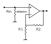 Così ho iniziato a pensare di usare un primo stadio Non Invertente con la R da 300kohm in parallelo verso massa, quindi in questo modo: