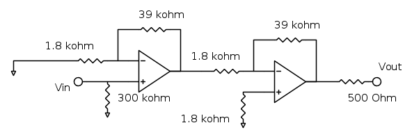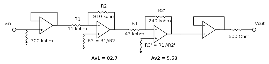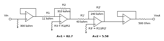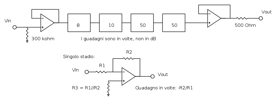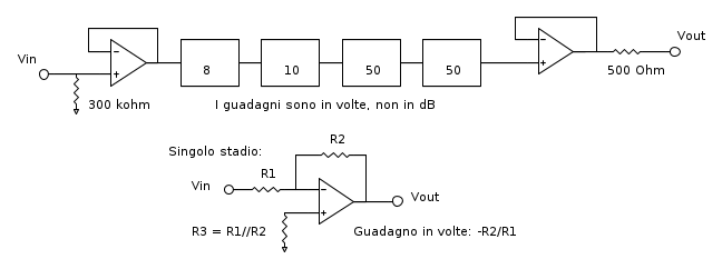 Innanzitutto ho provato a realizzare più stadi uguali, tutti Invertenti. Subito però mi sono accorto che non era conveniente perché, avendo nel primo stadio la R1 vincolata a 300kohm e la R2 che dev'essere inferiore a Rid/2 = 1Mohm non potevo ottenere un guadagno abbastanza alto e avrei dovuto usare tantissimi stadi.