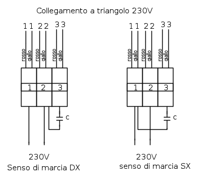 Con riferimento ai tuoi dati ti ho elaborato l’esecuzione del lavoro che devi fare. Ho predisposto il collegamento a triangolo, giacché lo devi alimentare dal 230 volt di casa. BYE