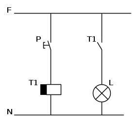 in genere questo tipo di timer (T1) per funzionare ha bisogno di un'alimentazione di rete, ovvero di un conduttore di fase (F) ed uno di neutro (N) che rappresentano appunto la tensione di rete di 230 V 50 Hz, ed un conduttore che dia l'impulso per attivare il timer proveniente dai pulsanti (P),questo conduttore in genere fornisce un impulso di fase,e poi c'è un ulteriore conduttore che rappresenta la fase di uscita per le lampade,(L) secondo questo schema generico: