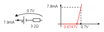 Utilizzando il modello a caduta di tensione costante, vedendo che i diodi sono in polarizzazione diretta, si calcola la corrente Id che scorre sul resistore da 1kOhm e quindi anche sulla serie dei tre diodi. Essa risulta 7.9mA.