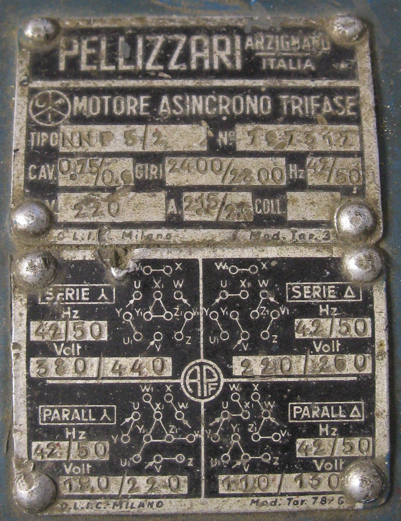 Buonasera a tutti, possiedo un vecchio motore trifase Pellizzari con morsettiera Marelli-Pellizzari a 12 morsetti progettato per funzionare a tensioni di rete differenti.
