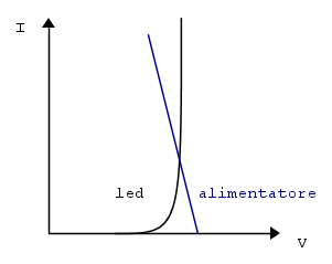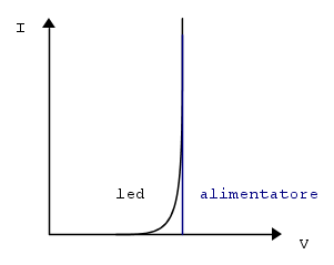 Se invece alimenti un led da 3V con un alimentatore che genera una tensione di 3V le cose vanno diversamente: se la tensione varia del 10% in meno o in più si hanno enormi variazioni della corrente che lo attraversa e della luminosità e si rischia di passare dallo spegnimento alla distruzione, questo a causa della bassa impedenza differenziale.