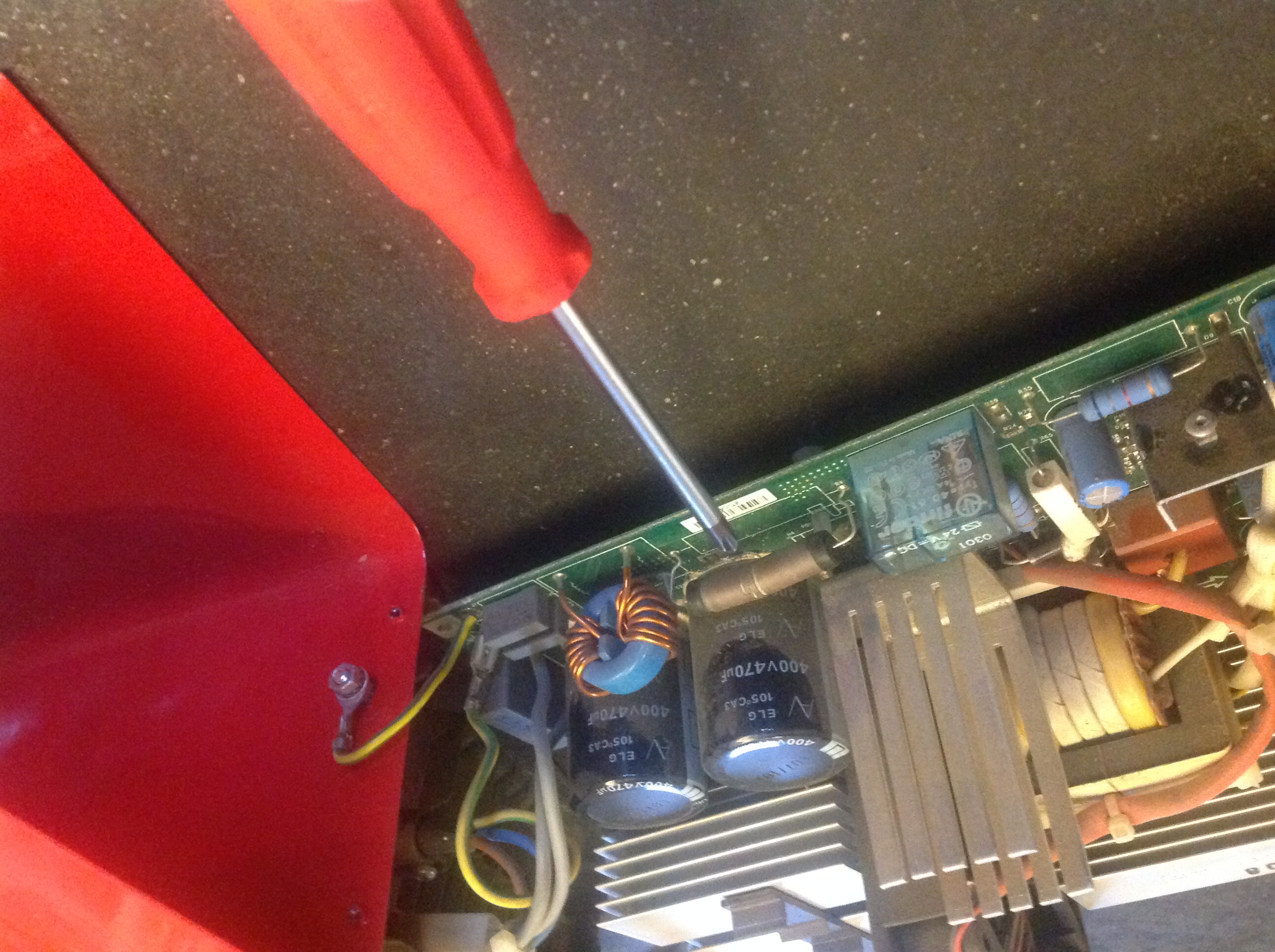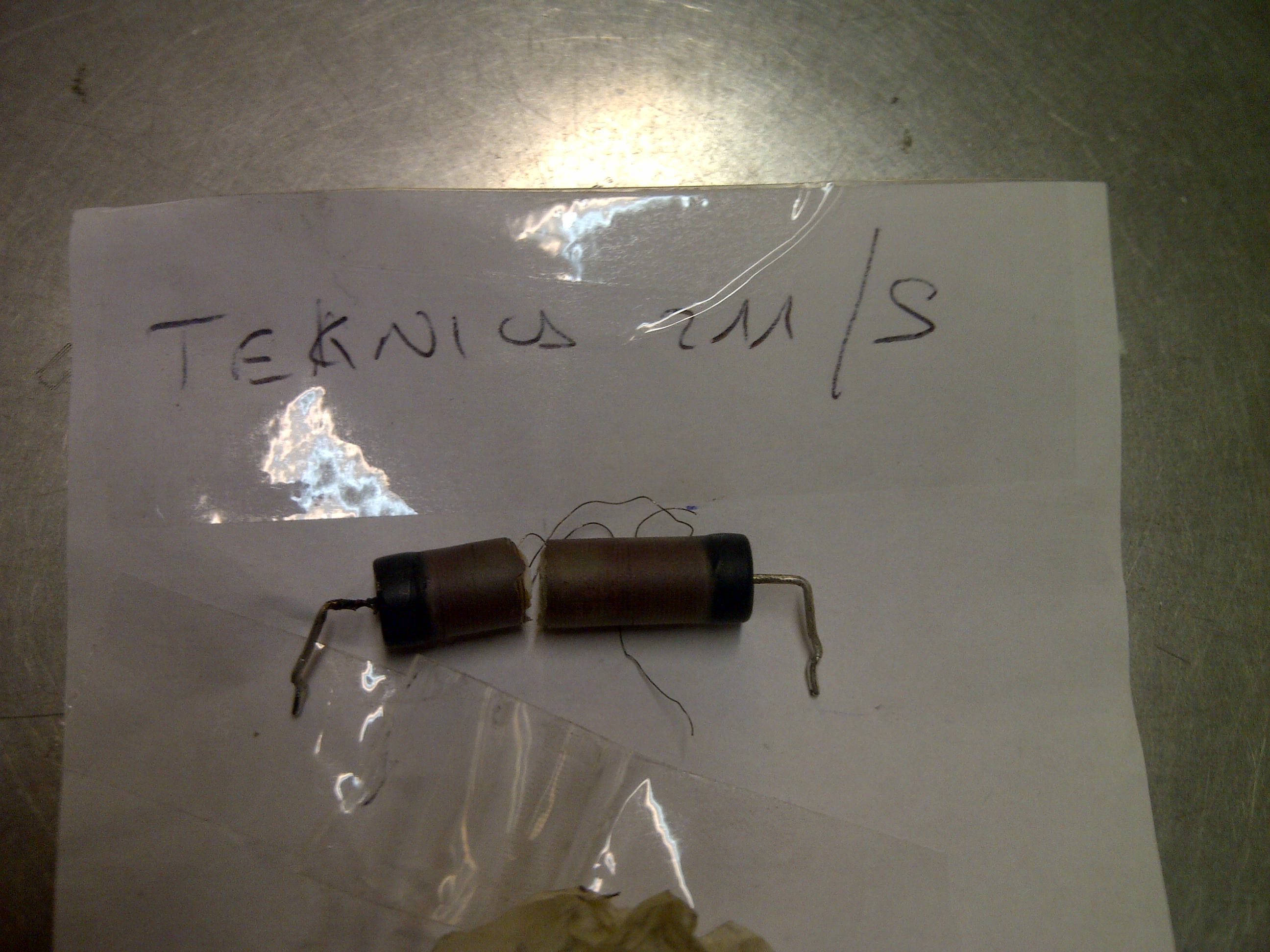 Stavo saldando,in modo discontinuo, da circa venti minuti a 50 ampere, quando l'elettrodo mi é rimasto attaccato al pezzo che stavo saldando. Anomalamente il salvavita é saltato. Ho riacceso l'impianto è appena ho riprovato a saldare é uscita una piccola fumata dall'interno della saldatrice e si é spenta. Smontandola ho notato che un componente, credo una resistenza (che nella foto vi indico con la punta del cacciavite) si é bruciata. Non riesco a leggere i valori della resistenza.