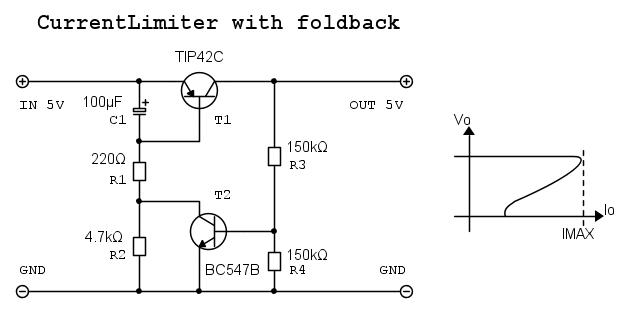 In questo articolo viene presentato un limitatore di corrente con foldback. La caratteristica di foldback e` importante, come viene ben spiegato, per limitare la corrente di cortocircuito in caso di malfunzionamento del carico. Il circuito presentato, nel caso di limitazione a 550mA, e` nello schema seguente, dove a destra e` indicata la caratteristica del foldback fornita dal circuito. Il parametro importante e` Imax, limite oltre il quale comincia ad intervenire la riduzione di corrente.