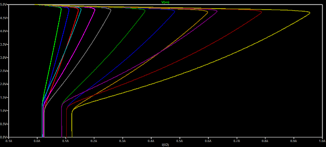 Una simulazione facendo variare il beta di T2 fra i suoi valori estremi di 200 e 450, e quello di T1 fra 25 (30 il minimo a VEC=4V, ma in condizioni normali il transistor e` al limite della saturazione) e 150 (tipico+50%) da` queste curve