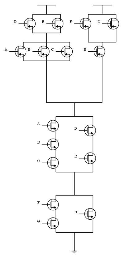3 - Per disegnare la parte pMOS, trasforma le serie nMOS in paralleli e i paralleli nMOS in serie