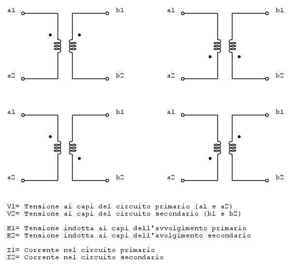 è tale che il polo positivo è il terminale contrassegnato dal puntino, la corrente indotta nel secondario esce dal terminale contrassegnato dal puntino che rappresenta il polo positivo della tensione indotta