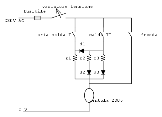 n.b. Ho rimosso un interruttore e posto la ventola in parallelo e non in serie ai resistori, se vuoi Solo regolare la velocità della ventola con il regolatore di tensione il regolatore va posto in serie a monte solo della ventola