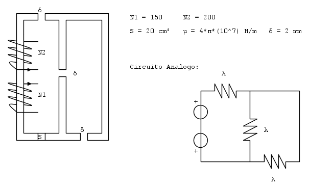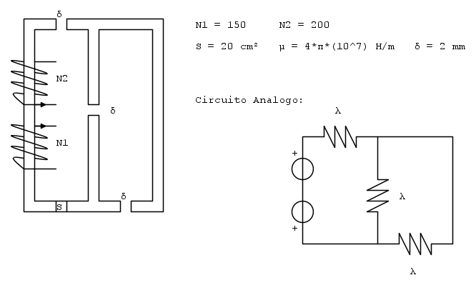 Ho provato ad iniziare il problema calcolando la riluttanza dei traferri: \lambda=\frac {\delta}{\mu \cdot S}=7,96 \cdot 10^5 H^{-1}.