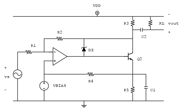 Per quanto riguarda il vout/vs, ho notato che per piccolo segnale il diodo diventa un cortocircuito, quindi l'uscita dell' A.O. (una conf. inv.) è collegata ad R3, quindi vout è uguale all'uscita dell'A.O. In questo modo sembrerebbe inutile la presenza di Q2. C'è qualcosa che non va nel mio ragionamento ?