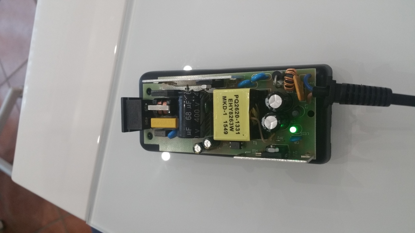Prova a vedere quanti volt escono dall'alimentatore, poi mettici una lampadina e guarda se lampeggia, nello stesso tempo prova con il tester per vedere quanti volt ti da. Secondo me potrebbe benissimo essere il condensatore da 68uF 400v. Se vuoi cambiarlo attento alla polarità ma anche al tensione.