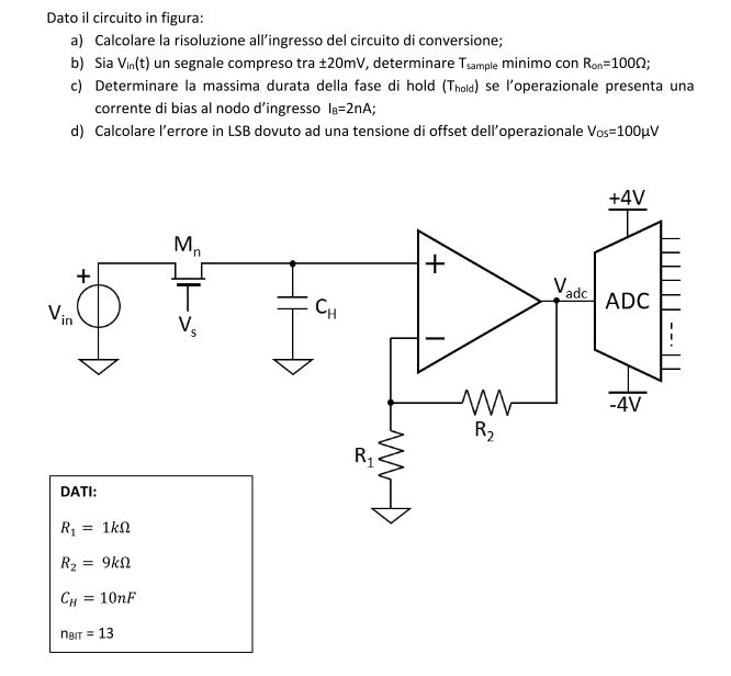 L'operazionale guadagna 10, dobbiamo caricare Ch con la precisione di 0,1mV se vogliamo che la precisione all'ingresso dello ADC sia pari a 1mV cioè il LeastSignificantBit.