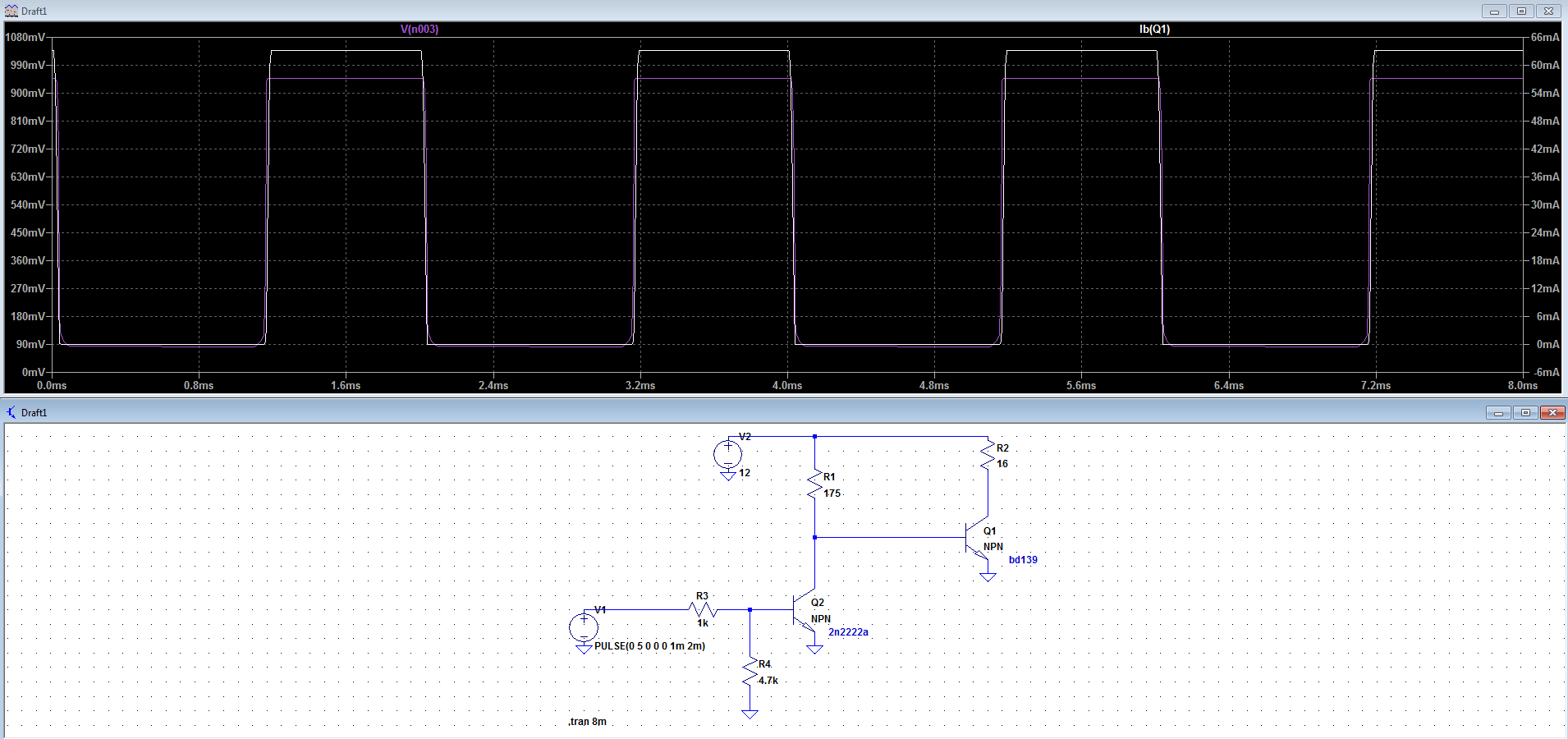 Allego simulazione del circuito (con npn generici). Segnale viola è la tensione di base e quello bianco della corrente di base del transistor bd139