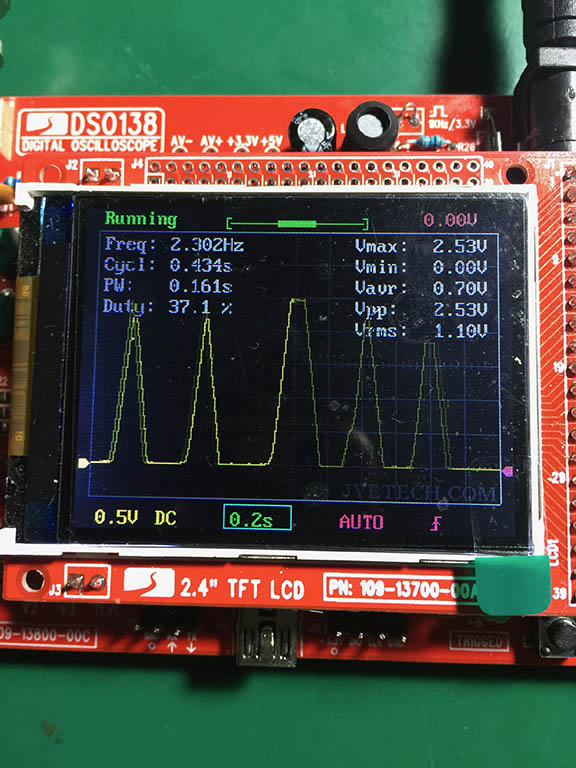 Ho misurato le tensioni (con il carico ovviamente, USCITA IMPOSTATA A 12V) con l'oscilloscopio per determinare se ci sono variazioni: sull'uscita del 7824 (24 V) la tensione è stabile cosi come sull'uscita del 7805 (5V). Sul pin del K la tensione è ballerina: Qui ci sono le foto che ho fatto riguardo all'uscita K: