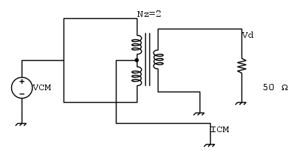 Nello schema illustrato di seguito, il trasformatore è usato per isolare il segnale di modo comune da quello differenziale. Il center-tap del trasformatore è collegato al ground, il segnale differenziale è chiuso su 50 Ohm. Qual è l´impedenza che vede il disturbo di modo comune ?