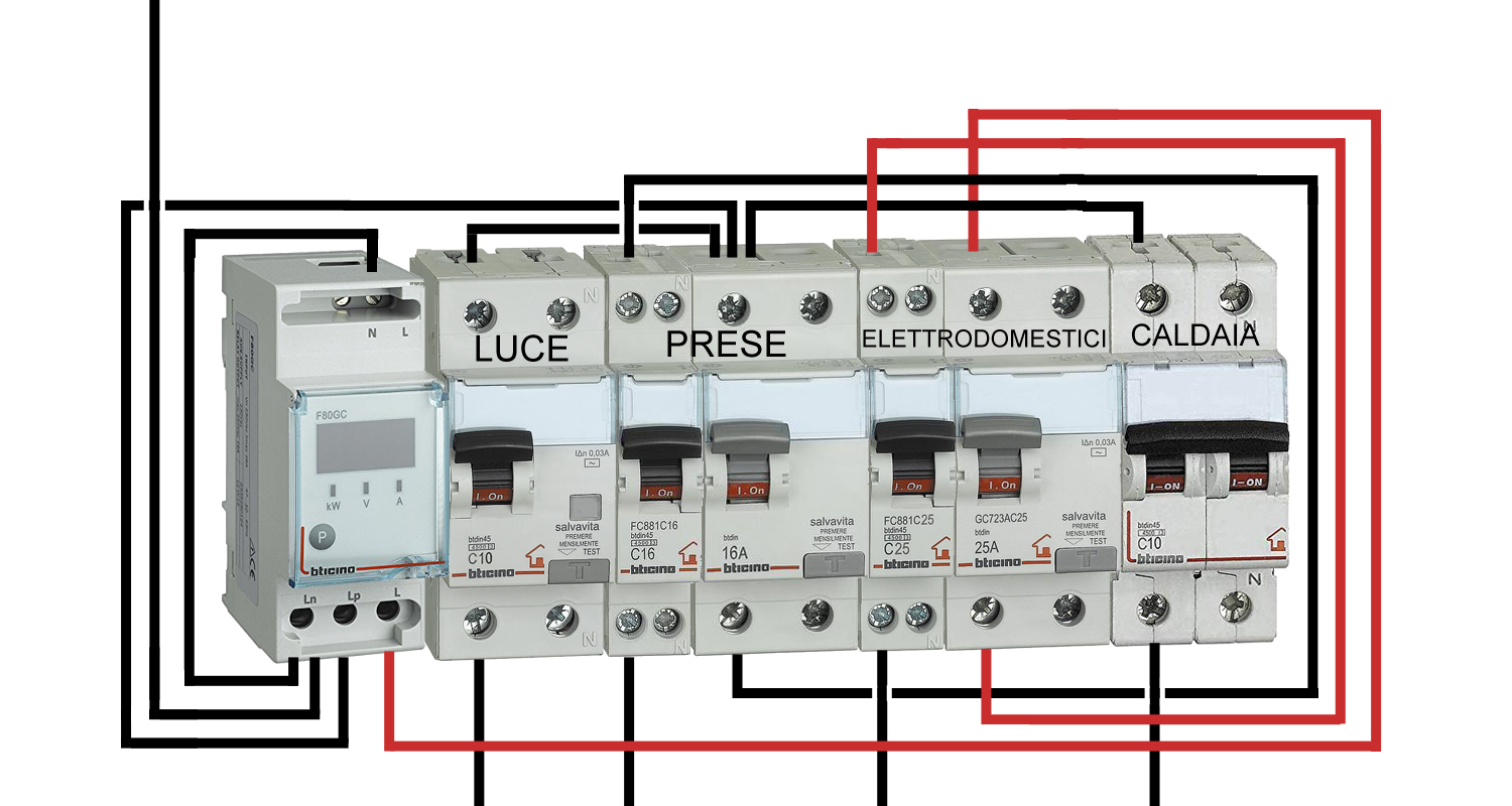 Ma infatti tutte le fasi dei carichi primari (luce, prese e caldaia) sono collegate su LP mentre solo la fase del carico secondario (elettrodomestici) è collegata su L