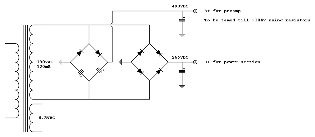 Visto che nel mio caso dispongo di qualche trasformatore in grado di fornire la tensione corretta per le piccole valvole finali pensavo se si poteva usare un circuito duplicatore per innalzare la tensione sino ad un valore dal quale poi poter ottenere quella necessaria per il preamplificatore tramite dei semplici filtri RC (vedi schema di partenza qui sotto) (ovviamente il salto al ribasso non è poco ma visto che tutto il pre consumerà circa 15mA ....)