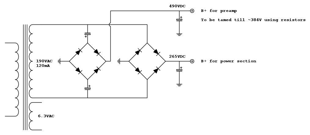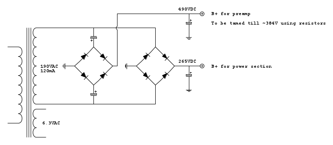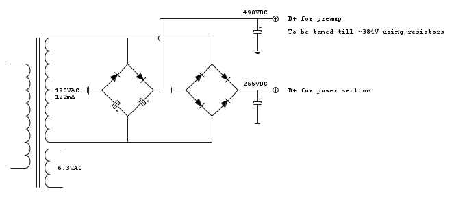 Per mantenere la stessa intonazione alla parte preamplificatrice è bene mantenere la tensione del circuito originale, quindi o si dispone di un trasformatore particolare o si può abbassare l'anodica per le finali con un circuito a mosfet