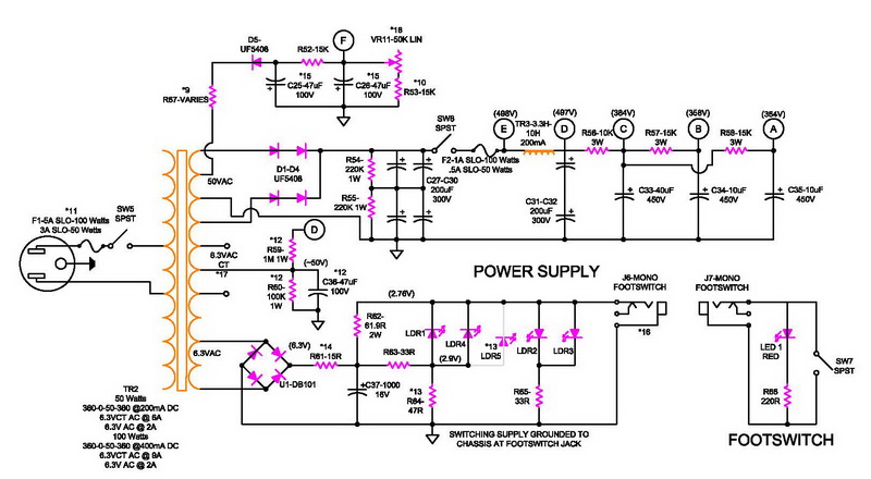 Non è infrequente che circuiti di amplificatori a valvole (per uso musicale) abbiano l'anodica attorno ai 450-500V per alimentare le valvole di potenza, tale tensione viene abbassata per alimentare le valvole della sezione preamplificatrice (nel caso della SLO da circa 490V a circa 385V)