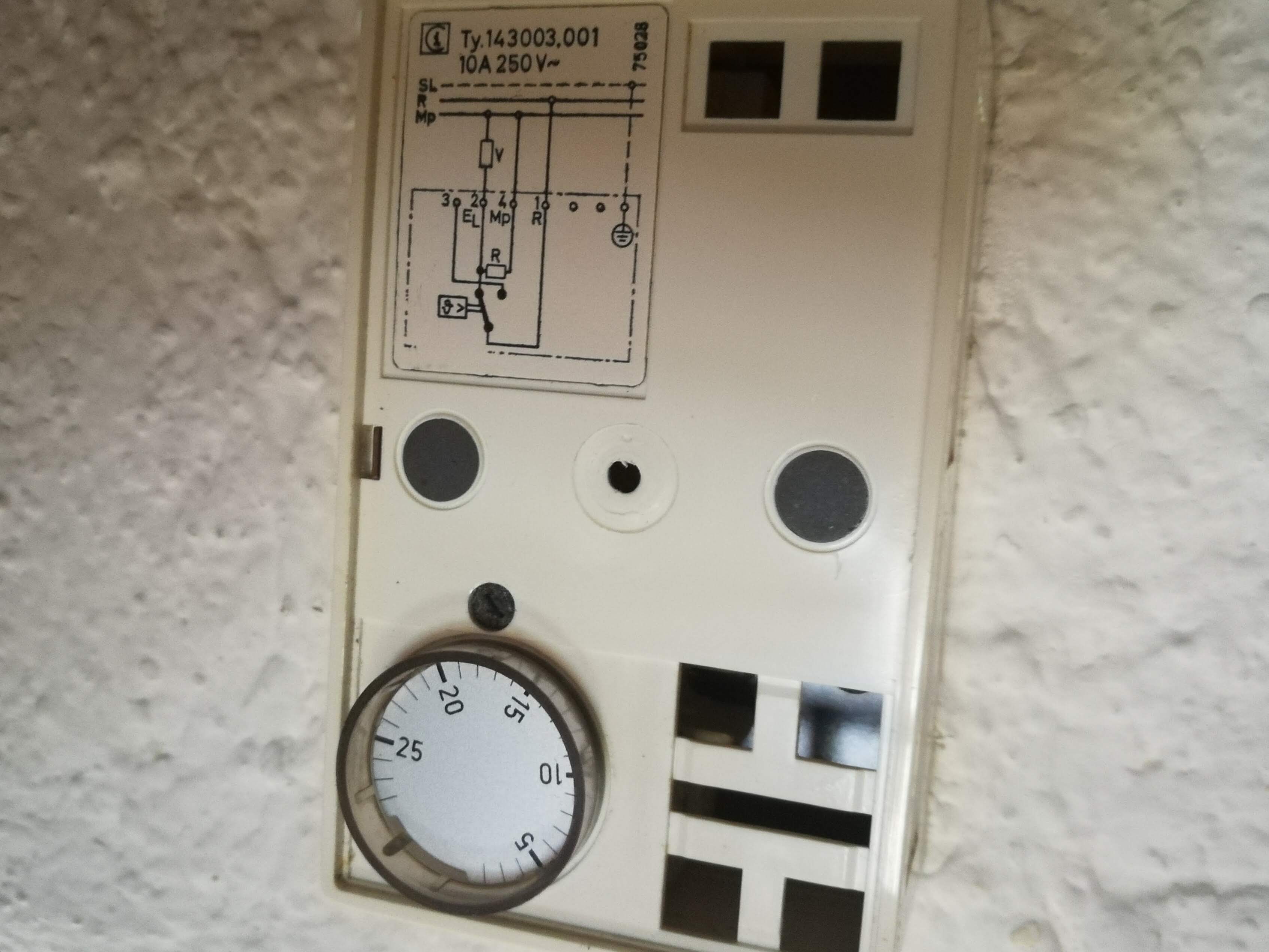 Al piano primo c’è il termostato meccanico (non conosco la marca) da sostituire collegato come in foto con un cavo azzurro, uno bianco ed uno marrone.